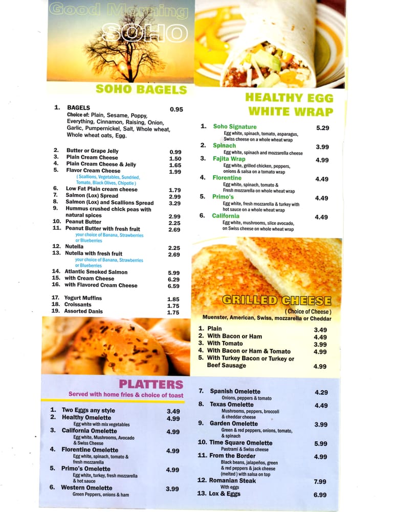 Located in Brooklyn, NY, Soho Cafe & Grill offers a diverse menu of deli, sandwich, and salad options. The establishment provides various amenities like delivery, takeout, reservations, and catering services. With a casual atmosphere and outdoor seating, Soho Cafe & Grill caters to a wide range of customers, including families and groups. The menu includes appetizers like chicken fingers parmigiana, mozzarella sticks, and super nachos. Customers can also create their own salads with a choice of meats, cheeses, and vegetables. Additionally, a selection of bagels is available for breakfast. Reviews from satisfied customers praise the endless food options, vegan offerings, and friendly staff. Overall, Soho Cafe & Grill stands out for its quality and variety of food, making it a must-visit spot for a satisfying meal.